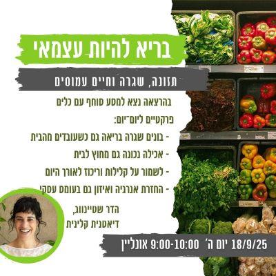 איך אפשר לנהל עסק תובעני בלי להזניח את הבריאות והאנרגיה האישית? הרצאה שמעניקה אסטרטגיות פשוטות לשילוב תזונה נכונה ואורח חיים בריא בתוך לוח זמנים צפוף. בהרצאה סוחפת נגלה איך תזונה, סדר יום והרגלים קטנ...